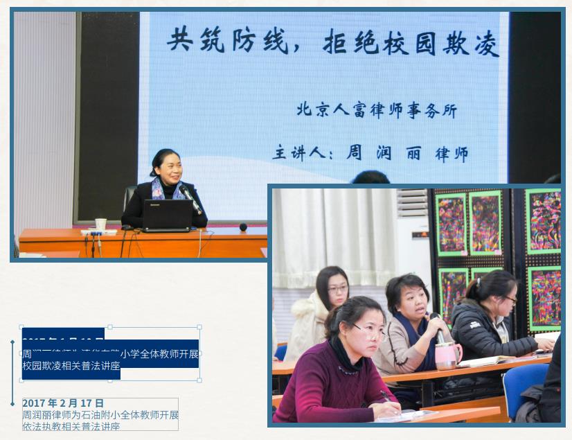 2017年1月10日,周润丽律师为清华东路小学全体教师开展校园欺凌相关普法讲座